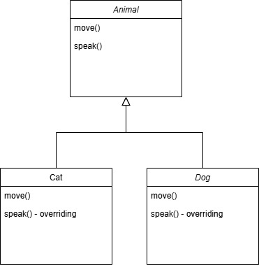 Cat, Dog Class는 Animal Class를 통해 move(), speak() 메서드를 상속받는다.