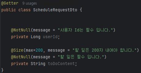 - `@NotNull`, `@Size` 어노테이션을 붙이면, 해당 필드에 유효성 위반시 `MethodArgumentNotValidException` 오류를 던집니다.