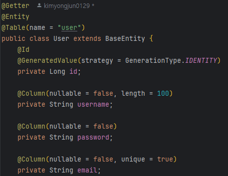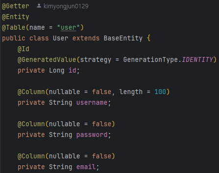 - `@GeneratedValue(strategy = GenerationType.IDENTITY)` : 기본 키의 값을 자동으로 생성하도록 JPA에 지시합니다. (INSERT 할 때 기본 키 값을 따로 지정하지 않아도 DB가 알아서 증가된 값을 넣어줍니다.)