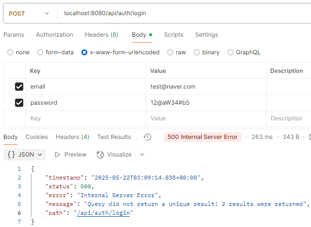 - 해당 이메일(`test@naver.com`)로 로그인 시, `Query did not return a unique result: 2 results were returned`라는 메시지와 함께 오류가 발생합니다.
