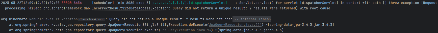 - 서버 오류에서는 `NonUniqueResultException`이 발생하였습니다.