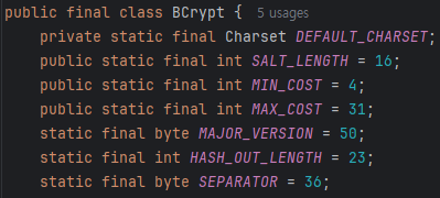- `BCrypt.MIN_COST` : `Cost Factor`가 들어가는 자리입니다.