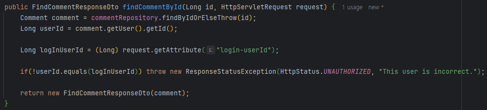 FindCommentResponseDto findCommentResponseDto = commentService.findCommentById(id, request);