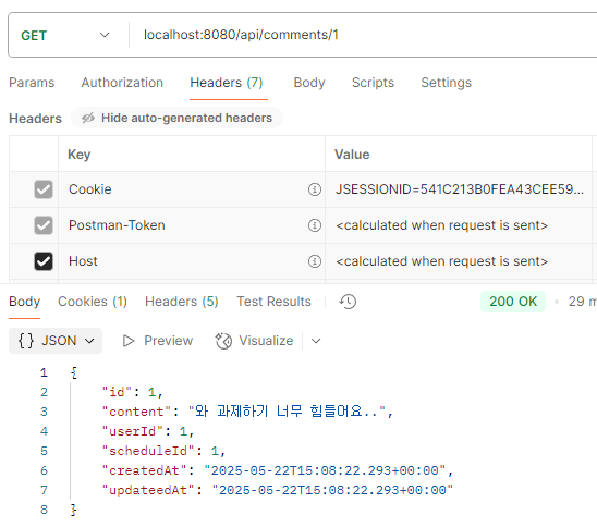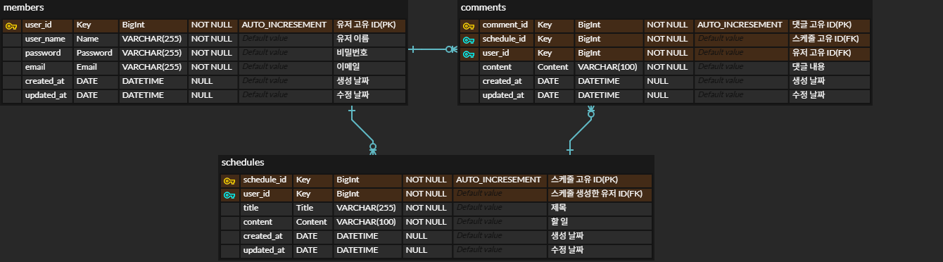 - ✅ 댓글 내용, 작성일, 수정일, 유저 고유 식별자, 일정 고유 식별자 필드