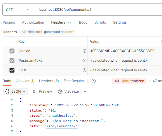 - 다음은 댓글을 조회하는 API를 사용했을 때, 해당 댓글을 작성한 유저의 아이디로 로그인하여 조회를 하였지만, 유저가 맞지 않다는 오류가 발생하였습니다.