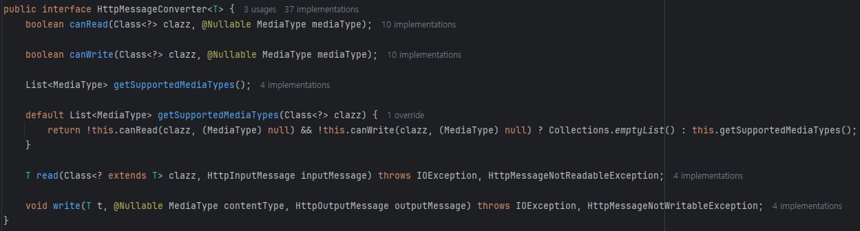 특정 클래스에 대해 지원 가능한 미디어 타입을 반환합니다. 기본 구현은 `canRead()` 또는 `canWrite()`가 가능한 경우에만 `getSupportedMediaTypes()` 결과를 반환하고, 그렇지 않으면 빈 리스트를 반환합니다. - `read()` :
