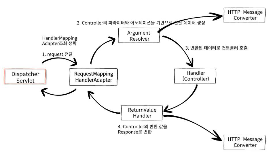 - 반환값에 `@ResponseBody` 또는 클래스에 `@RestController`가 붙은 경우 응답 본문으로 직렬화하기 위해 `HttpMessageConverter`를 호출합니다.