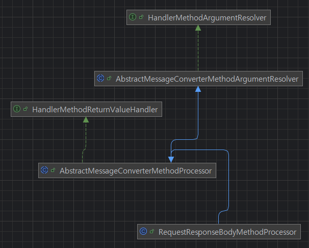 - 따라서 이 `RequestResponseBodyMethodProcessor` 구현체는 `HandlerMethodArgumentResolver`와 `HandlerMethodReturnValueHandler`를 둘 다 구현해야 합니다.