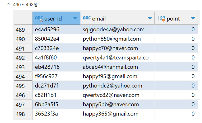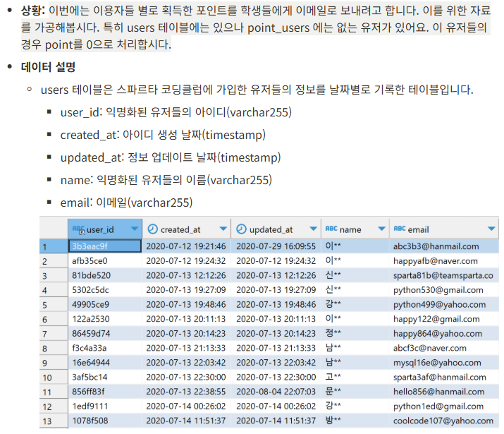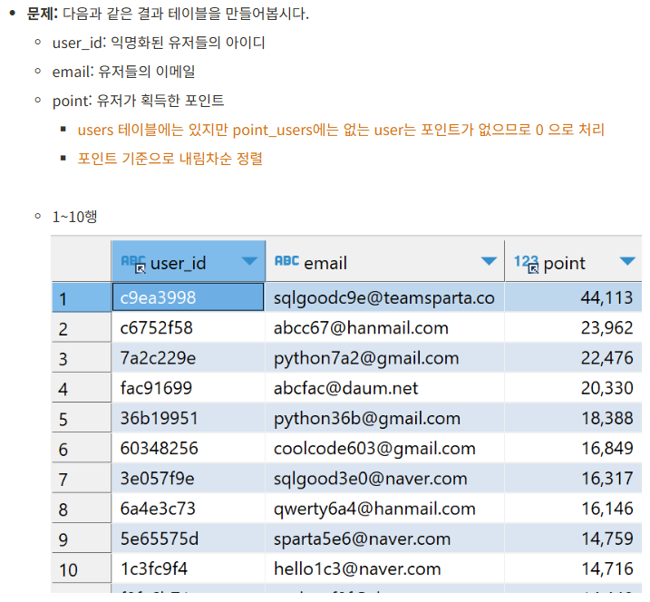 - SELECT → u.user_id, u.email, if(p.point IS NULL, 0, p.point)