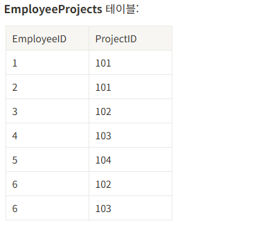 - employeesProjects 테이블이 projects 테이블과 employees 테이블을 이어줄 각 ID를 가지고 있기 때문에, JOIN 연산을 두 번 해야 한다.