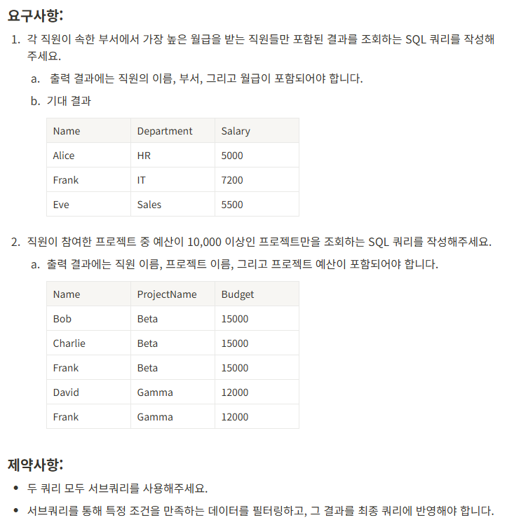- 부서에서 가장 높은 월급 : Group by Department와 집계함수 Max를 사용하였다. (서브쿼리)