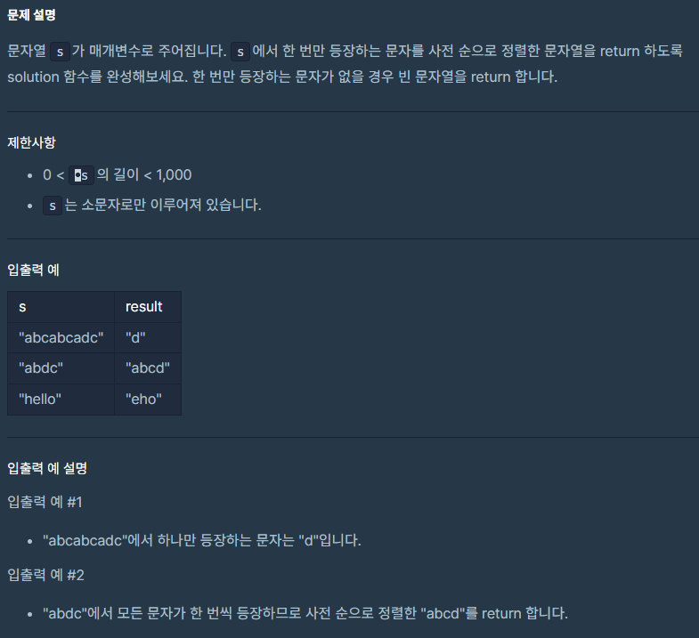 return "".join(sorted([char for char in char_count if char_count[char] == 1]))